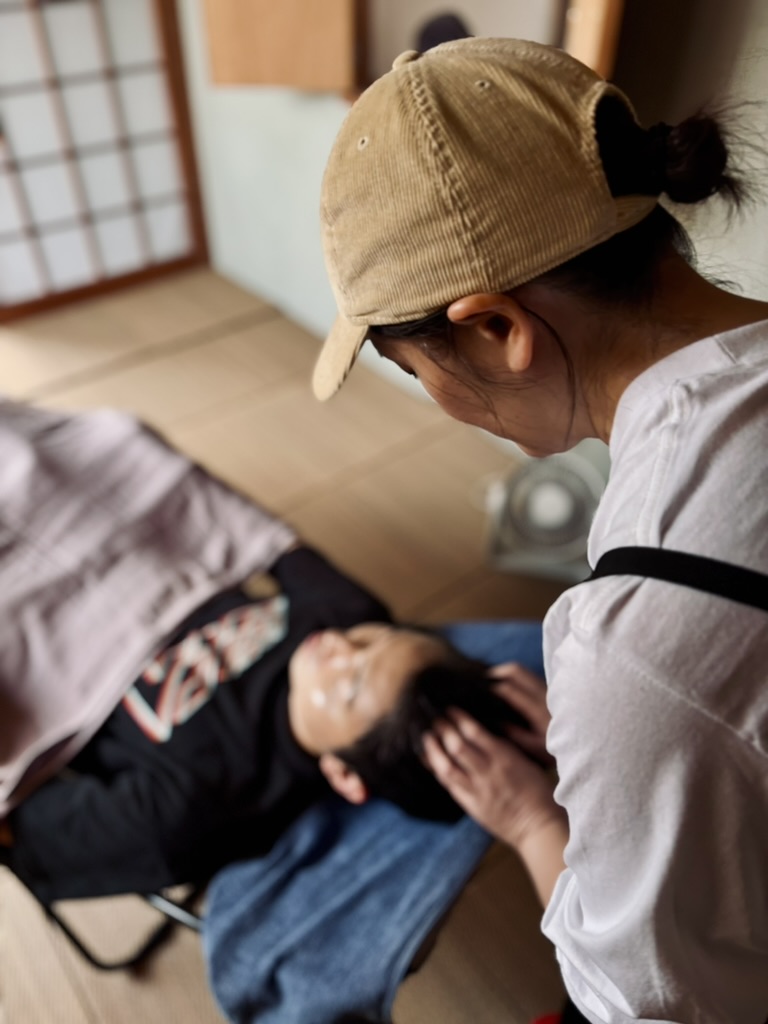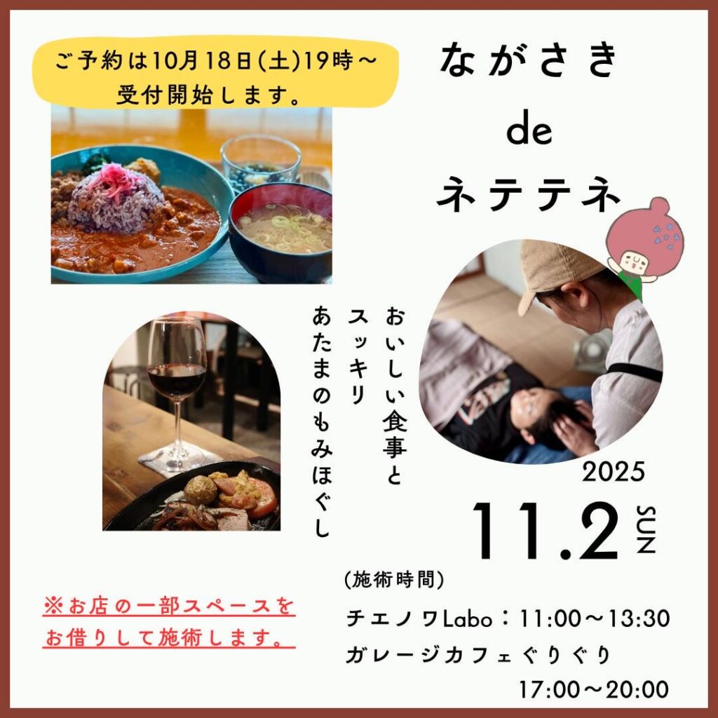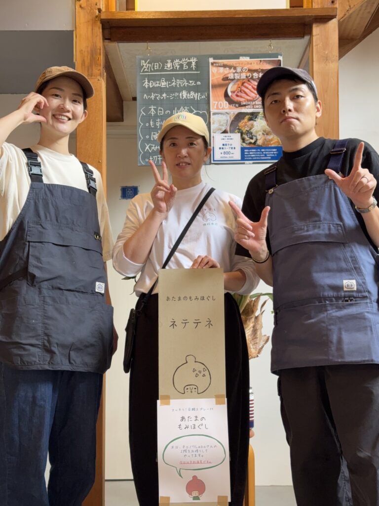 昼の部を「チエノワLabo」、夜の部を「ガレージカフェぐりぐり」で行う、ネテテネさんの”出張あたまのもみほぐし”です。