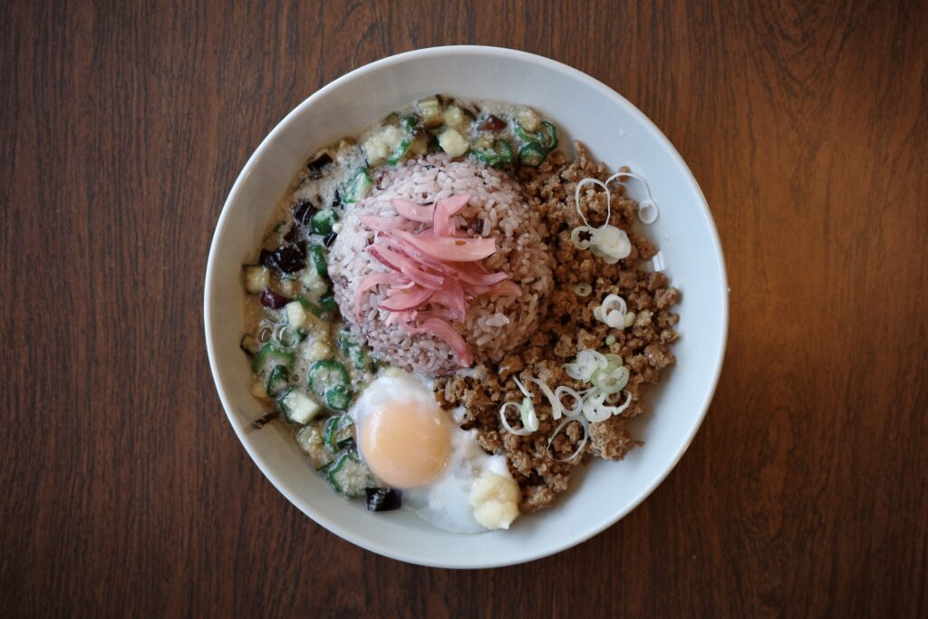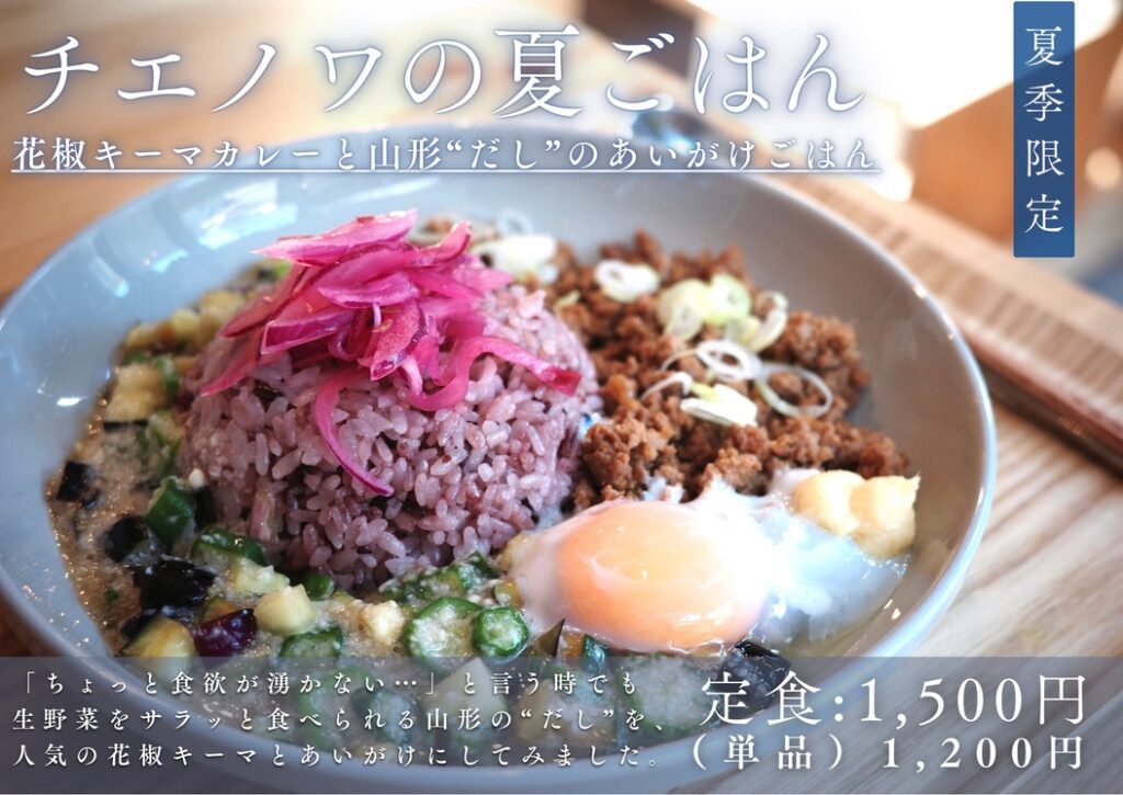 みんな大好き「花椒キーマ」と、山形の”だし”をあいがけにしたメニューです。