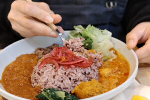 「スタミなっとう×3種のあいがけカレー」の組み合わせをご注文された方へは、以前の投稿のブログの内容のように「なっとうも混ぜると、またいいですよ!」とオススメしています。