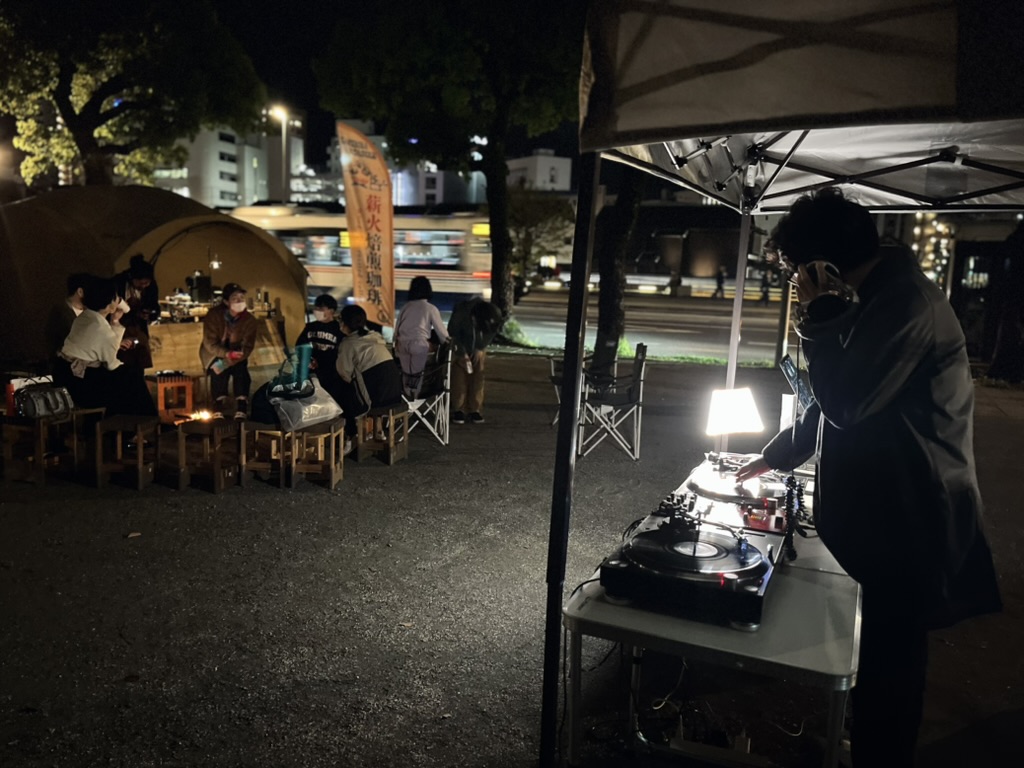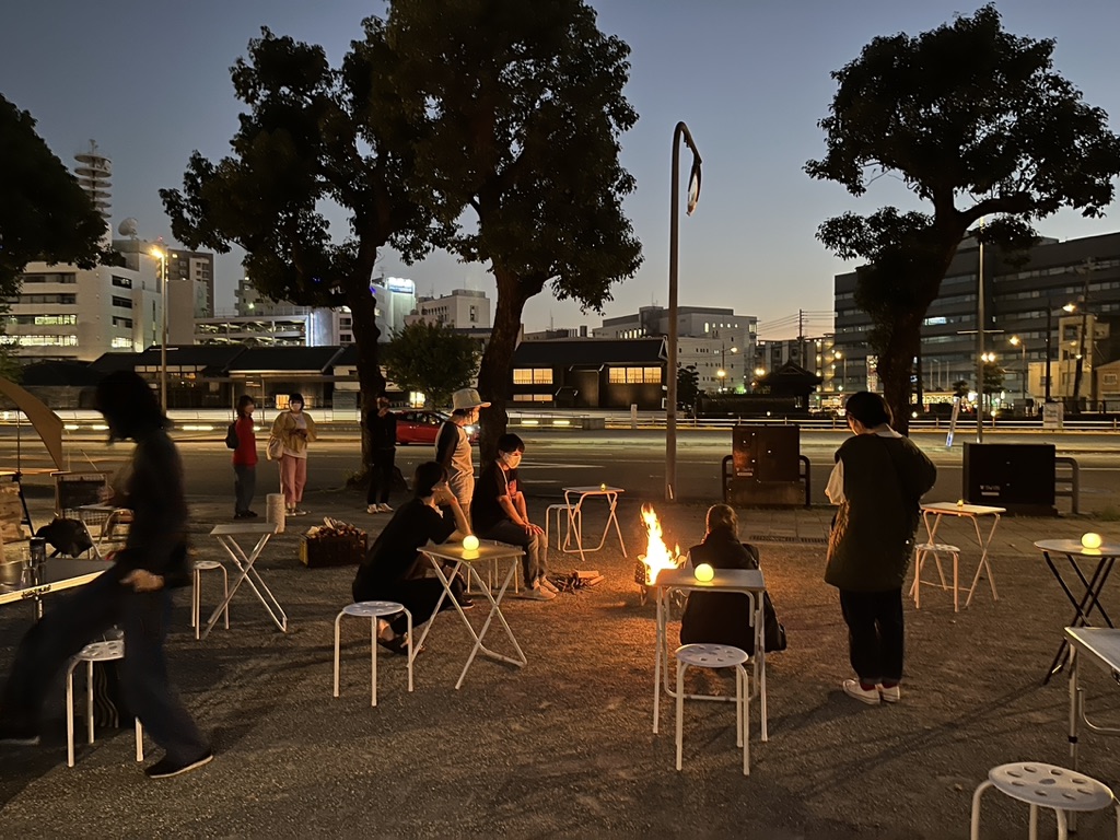 中島川を挟んで出島と向かい合う「県庁舎跡地」で、焚き火を囲みながらカレーを食べたり、美味しいお酒やお抹茶をいただいたり、音楽で楽しい気持ちになれたりする企画です。