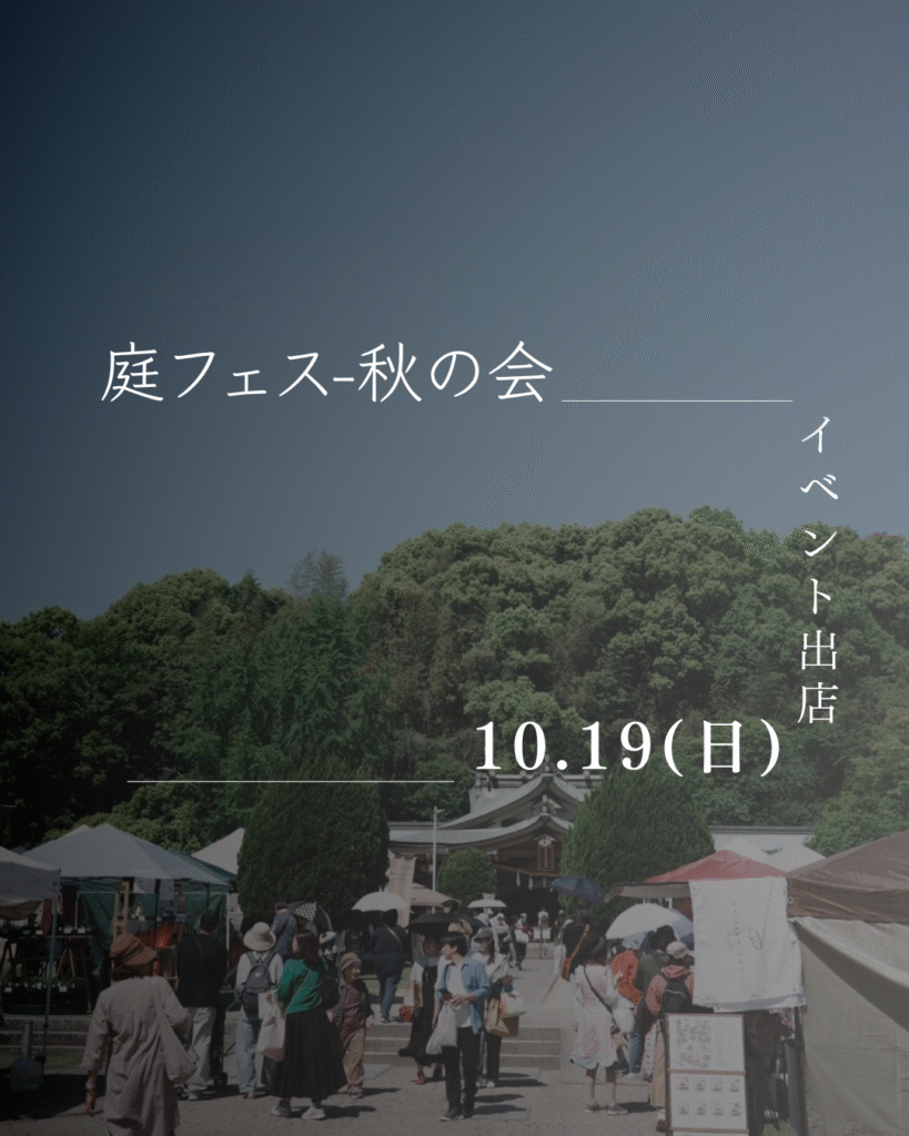 週末のイベント出店のお知らせです。護国神社の庭フェスの2日目である19日(日)に出店させていただきます。 今週末はお天気が心配ですが、どうにか日曜日は「くもり」予報で耐え忍んでいるようです。久しぶりの屋外イベント出店なので、ぜひとも雨だけは... -
