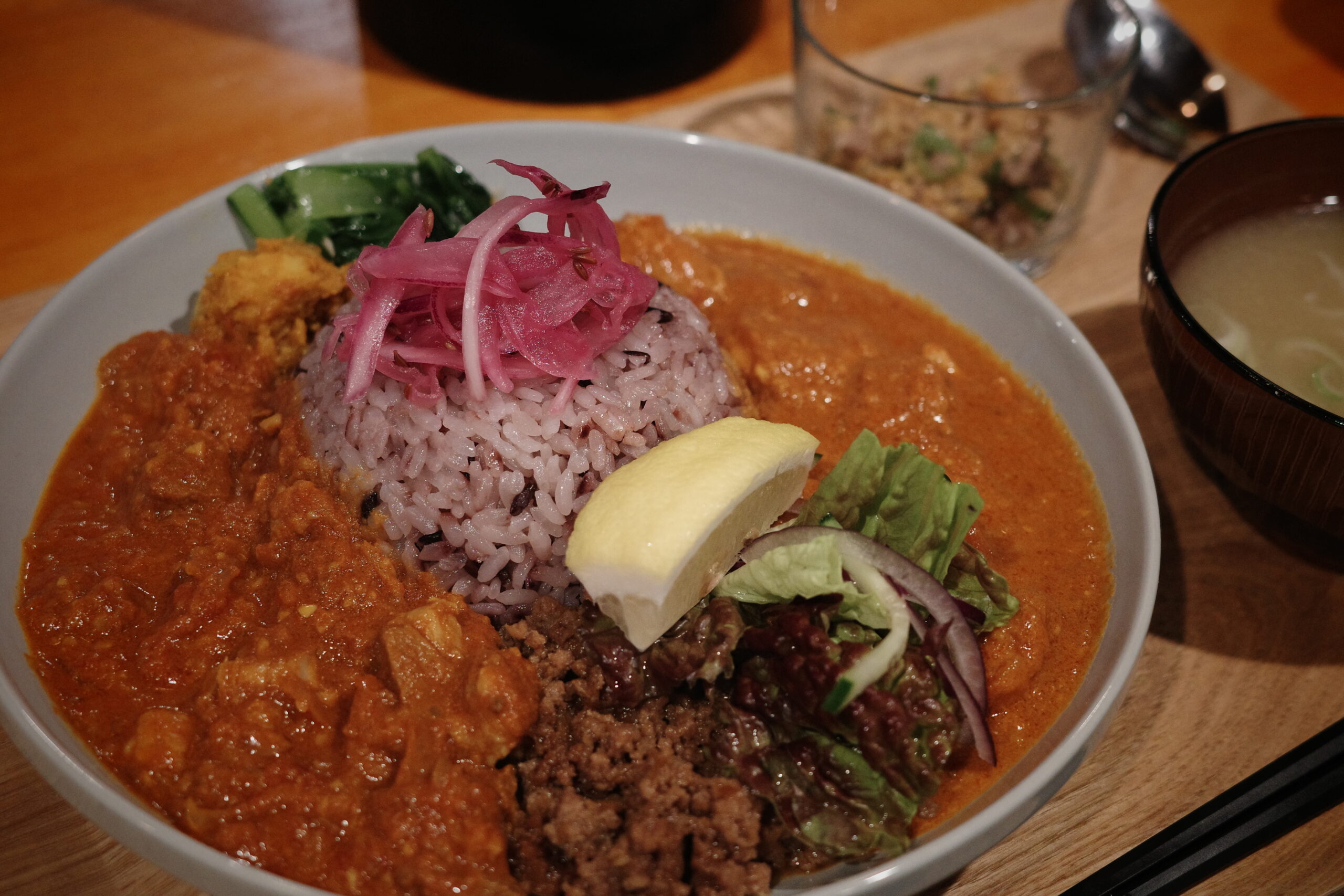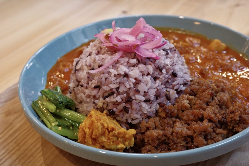 チエノワの看板メニューである「ポークビンダルーと花椒キーマのあいがけカレー」に「チエノワのチキンカレー」をさらにあいがけにした、チエノワのメニューの中ではある意味”豪華絢爛”なメニューをご用意するようにしました。